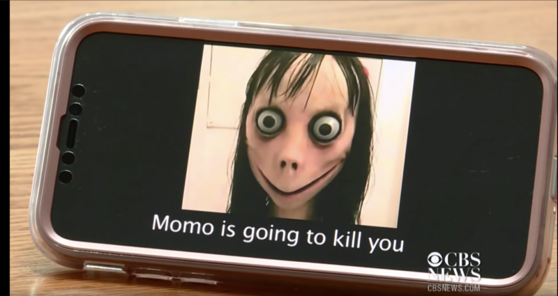 อีกกรณีหนึ่งที่ใช้เทคนิคคล้ายๆ กันและเกิดขึ้นช่วงไล่เลี่ยกันคือ Momo Challenge ซึ่งเป็นภาพรูปปั้นผู้หญิงครึ่งคนครึ่งนก ตาปูดโปน หน้าตาดูน่ากลัวในแกลเลอรีของประเทศญี่ปุ่น