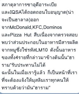ตามที่มีการส่งข้อความในโกโซเชียล ระบุว่า สภาตุลาการซาอุดิอารเบียและ IQSA ได้ถอนใบอนุญาต McDonald,KFC,Dominos และPizza Hut เนื่องจากมีการตรวจสอบพบว่า มีส่วนผสมองเนื้อหมูนั้น Muslim optical ได้ส่งข้อความพร้อมภาพถ่ายระบุว่า ได้ไปตรวจสอบร้าน KFC ที่มัสยิดฮารอม พบว่า ยังเปิดขายตามปกติ