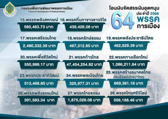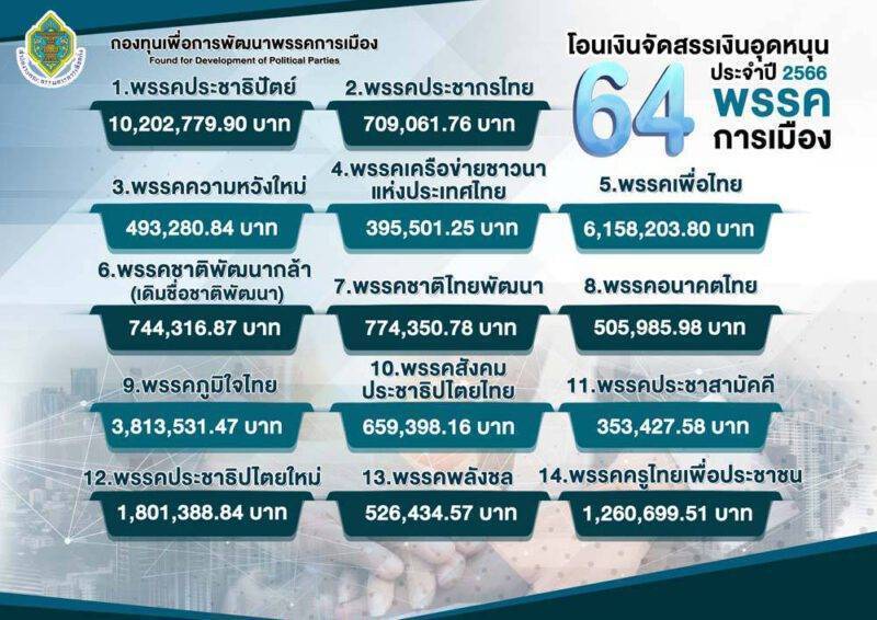 วันที่ 11 กุมภาพันธ์ 2566 ผู้สื่อข่าวรายงานว่า เพจ กองทุนเพื่อการพัฒนาพรรคการเมือง ของสำนักงานคณะกรรมการการเลือกตั้ง (กกต.) ได้ เผยแพร่ข้อมูลพรรคการเมืองที่ได้รับเงินอุดหนุน ประจำปี 2566 โดย 10 พรรคการเมืองแรกที่ได้รับเงินสูงสุด ประกอบด้วย