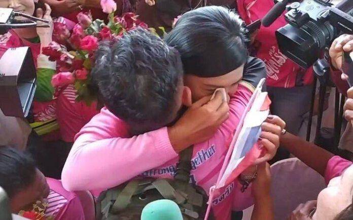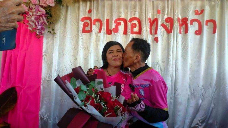 ทันทีที่พี่แมวเดินทางเข้ามาถึงภายในบริเวณที่ว่าการอำเภอทุ่งหว้าทางฝ่ายเพื่อนเจ้าสาวของพี่ยุ หรือนางสาวธนาภา เขียวอ่อน อายุ 56 ปี สาวชาวอำเภอทุ่งหว้า ได้ทำเซอร์ไพรส์เล็กๆ ด้วยการให้พี่แมวหาตัวเจ้าสาวให้เจอ โดยทุกคนภายในงานได้สวมเสื้อสีชมพูเหมือนกันสร้างความตื่นเต้นก่อนที่จะหากันจนเจอ ต่างโผเข้ากอดกันอย่างซาบซึ้งท่ามกลางกองเชียร์ที่ร่วมแสดงความยินดีและปลาบปลื้มกับความรักของทั้งสองในวันนี้