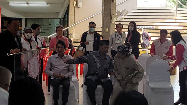 หลังจากนั้น นายจุติ ผู้บริหารพม. และผู้บริหารมูลนิธิ ได้ร่วมกันแจกถุงยังชีพให้ชาวบ้านยากไร้