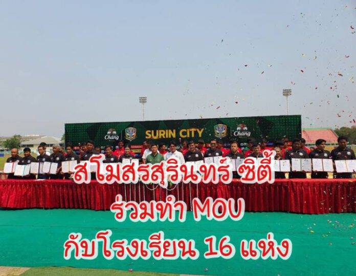 ที่สนามศรีณรงค์ ระหว่าง นายภัทรชัย มุ่งเจริญพร ประธานสโมสรสุรินทร์ ซิตี้ ได้ร่วมกันบันทึกข้อตกลงความร่วมมือ (MOU:Memorandum Of Understanding) ระหว่างโรงเรียนทั้ง 16 โรงเรียน กับ สโมสรสุรินทร์ ชิตี้ บันทึกข้อตกลงนี้จัดทำขึ้นเมื่อ วันที่ 11 มีนาคม 2566 ซึ่งทั้ง 16 โรงเรียน ได้ตกลงความร่วมมือเพื่อให้การสนับสนุนแลกเปลี่ยนระหว่างกันและกัน ตามกรอบข้อตกลง จำนวน 6 ด้าน คือ ทางสโมสรสุรินทร์ ซิตี้ ให้การสนับสนุนบุคลากร ผู้ฝึกสอนต้านกีฬาฟุตบอล เพื่อพัฒนาทักษะกีฬาฟุตบอลให้กับเยาวชน นักเรียน และประชาชนที่เกี่ยวข้อง, และทางสโมสรสุรินทร์ ซีตี้ ให้สิทธิในการประชาสัมพันธ์เป็นผู้เข้าร่วมสนับสนุนสโมสรฯ โดยการโฆษณาประชาสัมพันธ์ในสื่อของสโมสรฯ พร้อมทั้งสามารถใช้สื่อของสโมสรฯเพื่อ ประชาสัมพันธ์กิจกรรมของโรงเรียน, สโมสรสุรินทร์ ซีตี้ สามารถพิจารณาให้สิทธิอื่นใดตามความจำเป็น นอกเหนือจากรายละเอียดในข้อตกลงฉบับนี้ได้ตามสมควร โรงเรียนทั้ง 16โรงเรียน ต้องให้การสนับสนุนครู บุคลากร และนักเรียน เพื่อสนับสนุนการฝึกซ้อมการแข่งขัน และกิจกรรมของสโมสรฯ, โรงเรียนทั้ง 16 โรงเรียน ต้องให้การสนับสนุนการแข่งขัน ฝึกซ้อม รถรับ-ส่ง อุปกรณ์ที่มีความจำเป็นต่อการฝึกซ้อม การแข่งขัน และกิจกรรมของสโมสรฯ, และบันทึกข้อตกลงฉบับนี้ สามารถเปลี่ยนแปลงหรือเพิ่มเติมเนื้อหาที่จำเป็นได้ หากทั้งโรงเรียนทั้ง 16 โรงเรียน มีความประสงค์หรือต้องการ