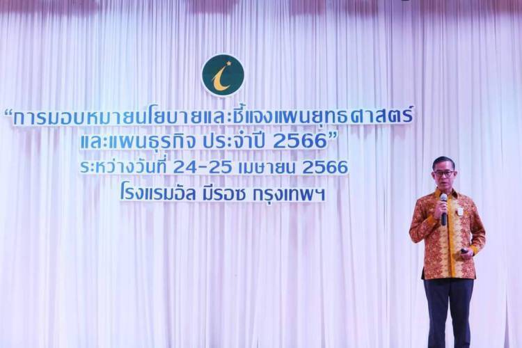 ดร.ทวีลาภ เปิดเผยว่า หลังจากที่ได้เข้ามารับตำแหน่งกรรมการและผู้จัดการไอแบงก์ เมื่อวันที่ 1 มกราคม 2566 ที่ผ่านมา ก็ได้รับมอบหมายจากคณะกรรมการธนาคารให้ทบทวนแผนยุทธศาสตร์ธนาคาร ซึ่งประกอบด้วยทิศทางการดำเนินงานในระยะยาว 5 ปี และระยะสั้นหรือเร่งด่วนของปี 2566 จึงได้นำเสนอแผนดังกล่าวต่อคณะกรรมการธนาคารและหน่วยงานกำกับดูแล โดยปรับวิสัยทัศน์ของธนาคารใหม่ “เป็นสถาบันการเงินที่ให้บริการตามหลักชะรีอะฮ์เพื่อความยั่งยืน” เพื่อยกระดับการบริการทางการเงินของธนาคารให้เท่าเทียมสถาบันการเงินอื่น ยึดมั่นในหลักธรรมอิสลามหรือหลักชะรีอะฮ์ ซึ่งเป็นประโยชน์กับทุกศาสนิก ตลอดจนดำเนินธุรกิจด้วยความรับผิดชอบต่อสิ่งแวดล้อม สังคม และอยู่ภายใต้หลักธรรมาภิบาลที่ดี โดยในช่วงเช้าได้มีการชี้แจงแนวทางการดำเนินงานภายใต้วิสัยทัศน์ใหม่ ให้แก่ผู้บริหารสาขาทั่วประเทศได้รับทราบโดยทั่วกัน พร้อมทั้งคณะกรรมการธนาคารนำโดยประธานกรรมการ (นายภูมิศักดิ์ อรัญญาเกษมสุข) เข้าร่วมมอบนโยบายในครั้งนี้ด้วยโดยแผนยุทธศาสตร์ด้านพันธกิจมุ่งเน้นกลยุทธ์ในการสร้างสรรค์ผลิตภัณฑ์ภายใต้แนวคิด ESG คำนึงถึงสิ่งแวดล้อมและสังคม ตอบโจทย์ความยั่งยืน สามารถเข้าถึงกลุ่มเป้าหมายหลักซึ่งเป็นพี่น้องมุสลิมและลูกค้าทั่วไป อาทิ สินเชื่อบ้านมีหนี้ลด เป็นการช่วยเหลือลูกค้าลดภาระการผ่อนชำระหนี้ ด้วยการรวมหนี้ต่างๆ ไม่ว่าจะเป็นหนี้บัตรเครดิตหรือหนี้บุคคลเข้ากับหนี้ที่อยู่อาศัย ทำให้ลูกค้าสามารถผ่อนชำระในอัตราย่อมเยา และระยะเวลายาวนานขึ้น เสมือนมีรายได้คืนมาบางส่วน โครงการชุมชนซื่อสัตย์ เป็นสินเชื่อเพื่อช่วยเหลือพี่น้องมุสลิมระดับฐานรากให้หลุดพ้นหนี้นอกระบบ กลับมาอยู่ในระบบสถาบันการเงิน นอกจากนี้ยังมี สินเชื่อธุรกิจฮาลาลครบวงจร จะสนับสนุนผู้ประกอบการที่สนใจในตลาดธุรกิจฮาลาล แต่ยังขาดแหล่งทุน ขาดความรู้ความเข้าใจ เพื่อส่งเสริมต่อยอดให้เป็นผู้ประกอบการฮาลาลเต็มรูปแบบได้ สำหรับผู้ประกอบการที่มีธุรกิจฮาลาลอยู่แล้ว ไอแบงก์จับมือกับพันธมิตรหลายภาคส่วนในการเพิ่มศักยภาพ ยกระดับสินค้าของผู้ประกอบการ ให้สามารถส่งออกไปนานาประเทศได้ ตลอดจนช่วยพัฒนาเป็นสินค้าฮาลาลเพื่อสังคมและยั่งยืน ด้านการสนับสนุนนโยบายภาครัฐ ที่มีแนวทางการพัฒนาภาคใต้ผ่านการพัฒนาระเบียงเศรษฐกิจพิเศษภาคใต้ การพัฒนาเขตเศรษฐกิจพิเศษชายแดน เพื่อแก้ไขปัญหาเศรษฐกิจในพื้นที่จังหวัดชายแดนภาคใต้นั้น ธนาคารยังคงดำเนินการขับเคลื่อนการเข้าถึงบริการทางการเ
