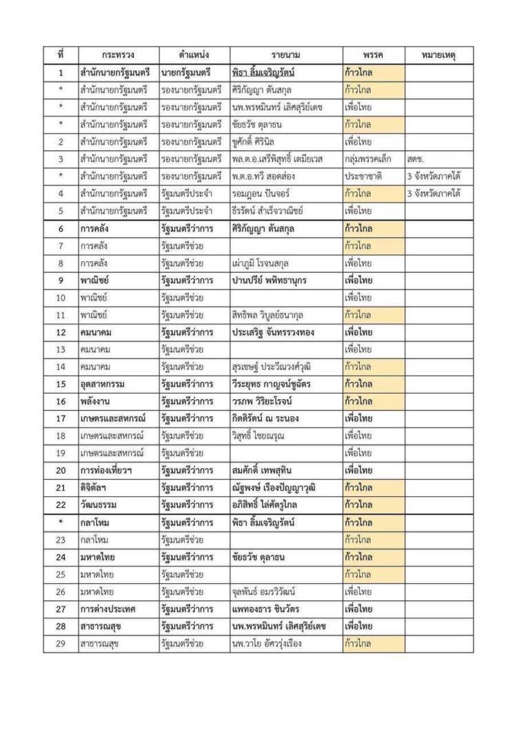 ร่างโผครม.พิธา 1 พิธา ควบกลาโหม แพทองธาร ต่างประเทศ ศิริกัญญา ตันสกุล รองนายกฯควบคลัง รอมฎอ ปันจอร์ รมต.ประจำสำนักฯคุม3 จังหวัด เสรีพิสุทธิ์ รองนายกฯคุมตำรวจ
