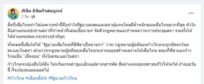 วันที่ 27 พฤษภาคม 2566 รศ.ดร.พิชิต ลิขิตกิจสมบูรณ์ อดีตอาจารย์คณะเศรษฐศาสตร์ มหาวิทยาลัยธรรมศาสตร์ โพสต์ข้อความผ่านเฟซบุ๊ก มีเนื้อหาดังนี้…“สิ่งที่เพื่อไทยทำได้เฉพาะหน้านี้คือทำให้รัฐบาลผสมและสภาผู้แทนใหม่มีน้ำหนักของเพื่อไทยมากที่สุด หัวใจคือตำแหน่งประธานสภาที่ทำหน้าที่เสนอชื่อนายก จัดคิวกฎหมายและกำหนดวาระการประชุมสภา รวมทั้งให้ได้ตำแหน่งรมต.กระทรวงสำคัญๆ”