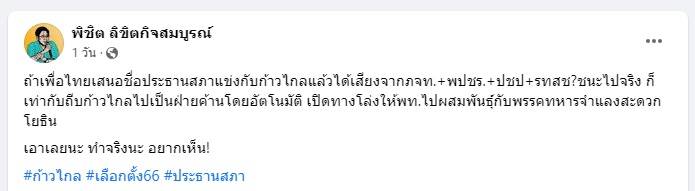 “ก้าวไกลจะต้องยืนให้มั่น ไม่หวั่นเกรงคำขู่แบล็กเมล์ต่างๆสารพัด ยึดตำแหน่งยุทธศาสตร์ไว้ให้จงได้ ถ้าถอยวันนี้ ก็จะต้องถอยตลอดไป” และ “ถ้าเพื่อไทยเสนอชื่อประธานสภาแข่งกับก้าวไกล แล้วได้เสียงจาก ภท.+พปชร.+ปชป+รทสช? ชนะไปจริง ก็เท่ากับถีบก้าวไกลไปเป็นฝ่ายค้านโดยอัตโนมัติ เปิดทางโล่งให้ พท.ไปผสมพันธุ์กับพรรคทหารจำแลงสะดวกโยธิน เอาเลยนะ ทำจริงนะ อยากเห็น!”