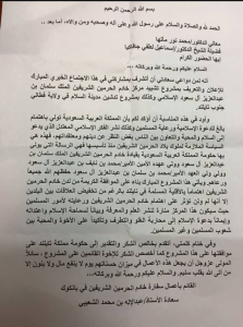 ข้าพเจ้าใคร่ยืนยันว่า ประเทศซาอุดีอารเบียได้เล็งเห็นความสำคัญต่อการเผยแพร่อิสลามและได้ดูแลกิจการของชาวมุสลิมมาโดยตลอด ตลอดจนเผยแพร่แนวคิดอิสลามสายกลางที่เชิญชวนสู่สันติภาพ ความรัก และความร่วมมือระหว่างมนุษย์ด้วยกัน โดยไม่จำกัดด้านศาสนาและความเชื่อ และนี่คือนโยบายที่สอดคล้องกับบรรดากษัตริย์ของประเทศสองแผ่นดินหะรอมตั้งแต่สถาปนาประเทศจวบจนปัจจุบัน และเป็นนโยบายที่ยึดปฎิบัติโดยรัฐบาลซาอุดีอารเบียภายใต้การนำของผู้พิทักษ์สองมัสยิดอันทรงเกีรยติกษัตริย์ซัลมาน บินอับดุลอาซิส อาลซาอูดและมกุฎราชกุมาร อะมีร มุฮัมมัด บิยนาเยฟ บินอับดุลอาซิส อาลซาอูด และมกุฎราชกุมาร อะมีรมุฮัมมัด บินซัลมาน บินอับดุลอาซิส อาลซาอูด ( ขอพระองค์ทรงคุ้มครองทั้งสองท่าน)