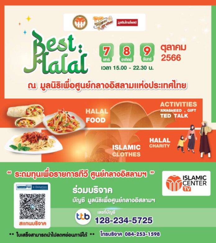 BEST HALAL 2023 งานระดมทุนเพื่อรายการทีวี ศูนย์กลางอิสลามฯ ระหว่างวันที่ 7 – 9 ตุลาคม 2566 (วันเสาร์-จันทร์) ณ มูลนิธิเพื่อศูนย์กลางอิสลามแห่งประเทศไทย รามคำแหง ซอย2