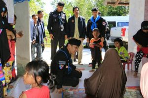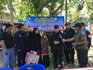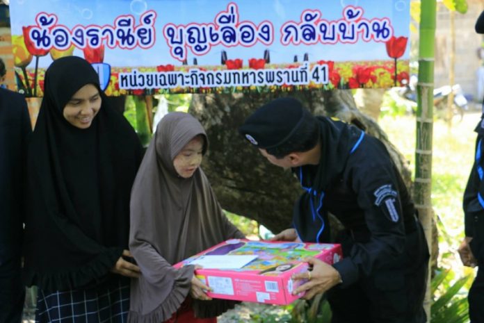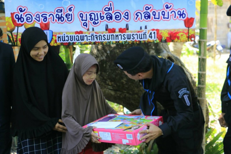 1 พ.ค.60 พ.อ.สิทธิศักดิ์ เจนบรรจง ผบ.ฉก.ทพ.41 เข้าพบปะ เยี่ยมเยียน แสดงความยินดี ในการกลับบ้านของ ด.ญ.รานีย์ บุญเลื่อง ผู้ป่วยโรคสะเก็ดเงิน(ทั้งตัว) ซึ่งเดินทางกลับภูมิลำเนาจากการที่หน่วยส่งไปรักษาตัวและดูแลเรื่องค่าใช้จ่ายในการรักษาที่ จ.บุรีรัมย์ ทั้งหมด พร้อมทั้งสังการให้หน่วยในพื้นที่รับผิดชอบ เข้าติดตามดูแลอาการอย่างต่อเนื่อง ในการนี้ ผบ.ฉก.ทพ.41 ได้มอบเงินช่วยเหลือเพิ่มเติม จำนวน 10,000 บาท และ ได้มอบของขวัญ ให้กับ ด.ญ.รานีย์ ฯ และจัดเลี้ยง ขนม ไอศกรีม แก่เด็กๆในหมู่บ้านโต๊ะปาเก๊ะ ต.วังพญา อ.รามัน จ.ยะลา