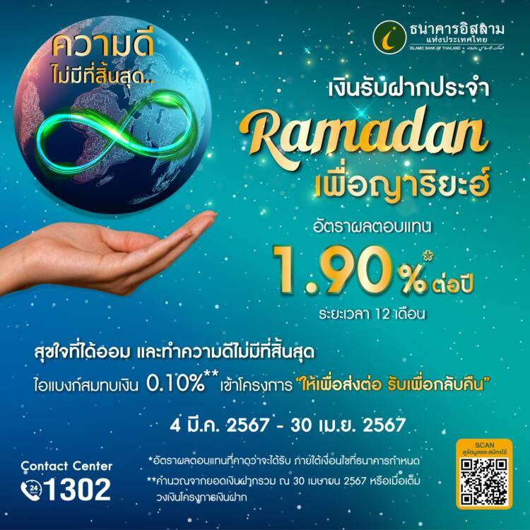 ในโอกาสเดือนรอมฎอนนี้อันทรงเกียรตินี้ ไอแบงก์ ส่งต่อความดีแบบไม่มีที่สิ้นสุด ด้วยเงินฝากสุดประทับใจ