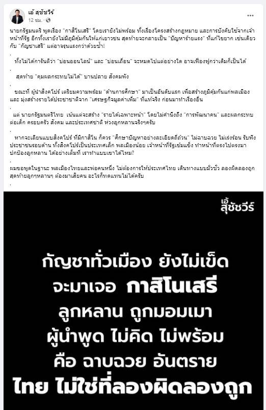 นายกรัฐมนตรี พูดเรื่อง “กาสิโนเสรี” โดยเรายังไม่พร้อม ทั้งเรื่องโครงสร้างกฎหมาย และการบังคับใช้จากเจ้าหน้าที่รัฐ อีกทั้งเรายังไม่มีภูมิคุ้มกันให้แก่เยาวชน สุดท้ายจะกลายเป็น “ปัญหาร้ายแรง” ที่แก้ไขยาก เช่นเดียวกับ “กัญชาเสรี” แต่อาจรุนแรงกว่าด้วยซ้ำ!