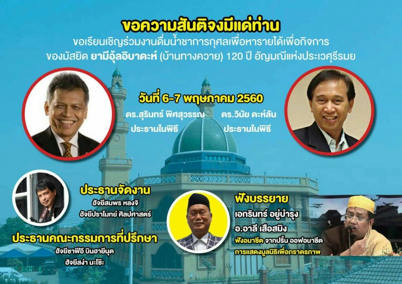 ขอเชิญร่วมงาน ร่วมภาคภูมิใจกับ…มัสยิดยามิอุ้ลอิบาดะห์( บ้านทางควาย) 120 ปี อัญมณีแห่งประเวศบุรีรมย์ วันที่ 6-7 พฤษภาคม 2560