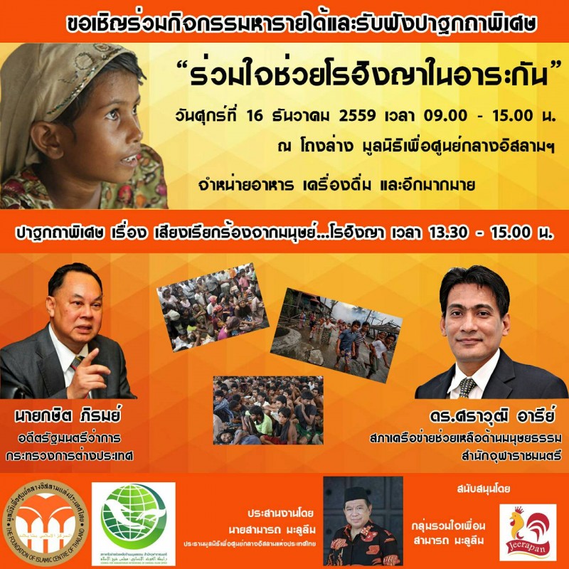 มูลนิธิเพื่อศูนย์อิสลามแห่งประเทศไทย ร่วมกับ สภาเครือข่ายช่วยเหลือด้านมนุษยธรรม สำนักจุฬาราชมนตรี ขอเชิญพี่น้องมุสลิม ขอเชิญร่วมกิจกรรมหารายได้และรับฟังปาฐกถาพิเศษ ในงาน “รวมใจช่วยเหลือโรฮิงญาในอาระกัน” วันศุกร์ที่ 16 ม.ค.59 เวลา 10.00 – 15.00 น. ณ โถงล่างมูลนิธิเพื่อศูนย์กลางฯ พบกับการจำหน่ายอาหาร เครื่องดื่ม และสินค้าอีกมากมายและรับฟังปาฐกถาพิเศษ เรื่อง เสียงเรียกร้องจากมนุษย์…โรฮิงญา โดยนายกษิต ภิรมย์ อดีตรัฐมนตรีว่าการกระทรวงการต่างประเทศ และ ดร.ศราวุฒิ อารีย์ สภาเครือข่ายช่วยเหลือมนุษย์ธรรม สำนักจุฬาราชมนครี ประสานโดยนายสามารถ มะลูลีม ประธานมูลนิธิเพื่อศูนย์กลางอิสลามแห่งประเทศไทย