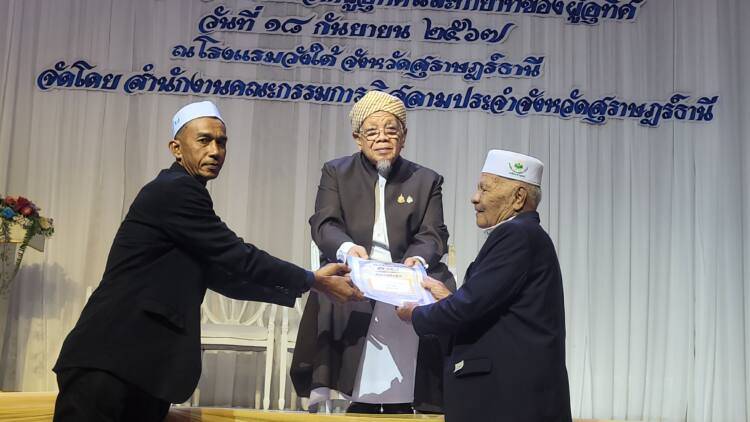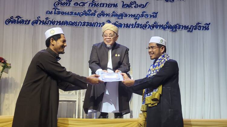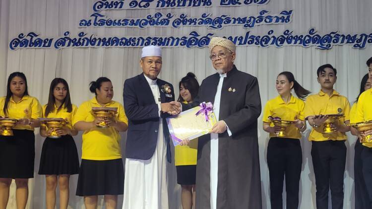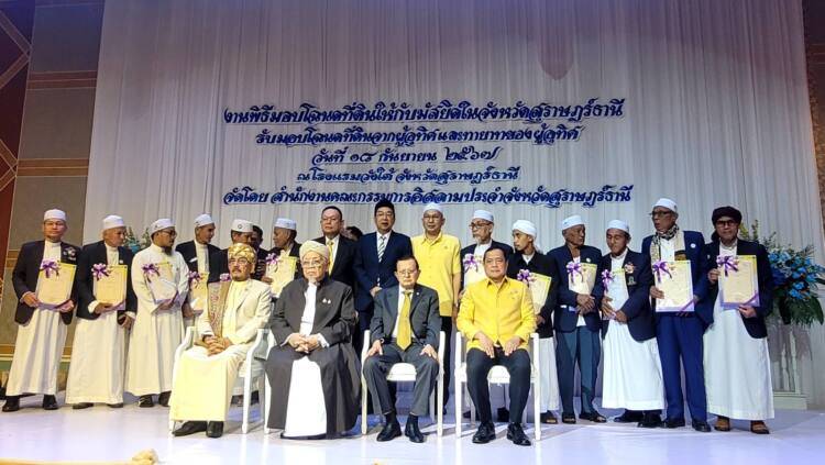 วันที่ 18 กันยายน ที่ห้องประชุมศณีวิชัยD คณะกรรมการอิสลามประจำจังหวัดสุราษฎร์ธานี ได้จัดพิธีมอบโฉนดที่ดินให้มัสยิดในจังหวัดสุราษฎร์ธานี มีนายธงชัย ปิติเศรษฐ ประธานคณะกรรมการอิสลามประจำจังหวัดสุราษฎร์ธานี เป็นประธานขจัดงาน มีนายอรุณ บุญชม จุฬาราชมนตรี เป็นประธานในพิธีมอบ โดยมีผู้เข้าร่วมงาน อาทิ นายอารีย์ วงศ์อารยะ อดีตรมว.มหาดไทย นายประสาน ศรีเจริญ ประธานคณะที่ปรึกษาจุฬาราชมนตรี นายณรงค์ สืบตระกูล อดีตที่ปรึกษาด้านประสิทธิภาพกรมที่ดิน ว่าที่ร้อยตรีสมศักดิ์ สันนประเสริฐ หัวหน้าผู้ตรวจราชการกรมที่ดิน นายเจษฎา จิตรัตน์ ผู้ว่าราชการจังหวัดสุราษฎร์ธานี นายศักดิ์กรียา บิลแสละ ประธานสมาพันธ์คณะกรรมการอิสลามประจำ 15 จังหวัดภาคใต้ พนักงานที่ดินจังหวัดสุราษฎร์ธานี นายพีรพจน์ เมธาพงษ์บริบูรณ์ ผู้ชำนาญการด้านการออกโฉนดที่ดินมัสยิด คณะกรรมการอิสลามอิสลามประจำจังหวัดสุราษฎร์ธานี ประธานและตัวแทนกอจ. 15 จังภาคใต้ อิหม่ามจังหวัดสุราษฎร์ธานี กลุ่มสตรี เข้าร่วมประมาณ 400 คน