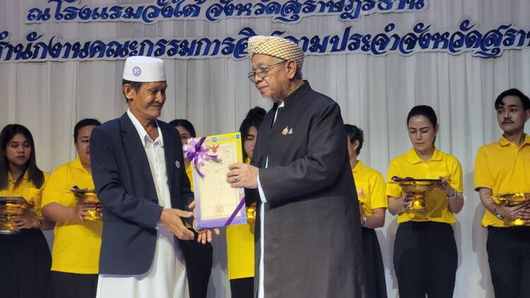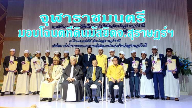กอจ.สุราษฎร์ธานี จัดพิธีมอบโฉนดที่ดินให้มัสยิดจังหวัดสุราษฎร์ธานี เพื่อแก้ปัญหามัสยิดไม่มีเอกสารสิทธิ์ ระบุ ตั้งมา 300 ปีแต่ไม่มีโฉนด ส่งผลต่อการบริหารจัดการ จุฬาราชมนตรี เป็นประธานมอบ ชี้เป็นหน้าที่ของผู้มีหน้าที่ ตั้งแต่จุฬาราชมนตรี-คณะกรรมการมัสยิดที่ต้องดูแลที่ดินวากั๊ฟ ยึดสุราษฎร์ฯเป็นต้นแบบ
