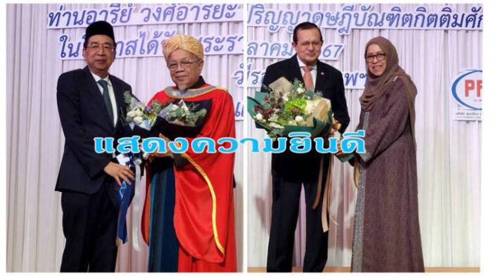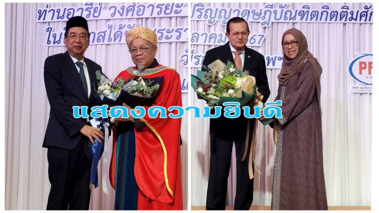 คณะกรรมการอิสลามประจำจังหวัดสุราษฎร์ธานี,มูลนิธิอัลอะมานะห์เพื่อการศึกษาและพัฒนา จ.สุราษฎร์ธานี, มูลนิธิศิลปวัฒนาแห่งสุเหร่าตรอกจันทร์ และบริษัท พุมเรียง เฟรชฟู๊ด ร่วมกันจัดงานแสดงความยินดี นายอรุณ บุญชม จุฬาราชมนตรี นายอารีย์ วงศ์อารยะ เนื่องในโอกาสรับปริญญาดุษฎีบัณฑิตกิตติมศักดิ์