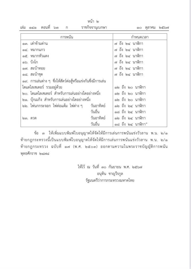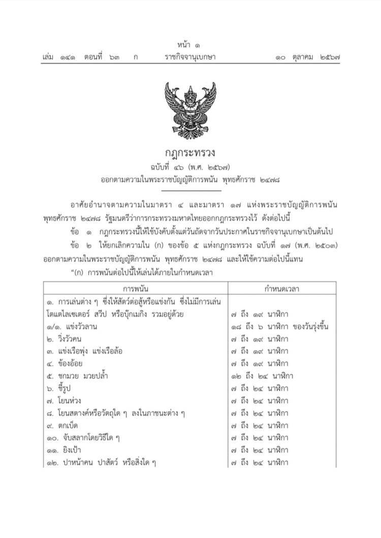 น.ส.ไตรศุลี ไตรสรณกุล โฆษกกระทรวงมหาดไทย กล่าวว่า วันนี้(10 ต.ค. 67) ราชกิจจานุเบกษาได้เผยแพร่ กฎกระทรวง ฉบับที่ 46 (พ.ศ. 2567) ออกตามความในพระราชบัญญัติการพนัน พ.ศ. 2478 ซึ่งมีสาระสำคัญกำหนดการแข่งวัวลาน ให้เป็นการพนันที่เล่นได้ในเวลาที่กำหนด ในเวลา 18.00 น. ถึง 6.00 น. ของวันรุ่งขึ้น เพื่อให้สอดคล้องกับประเพณีการเล่นแข่งวัวลานที่เล่นในเวลากลางคืน