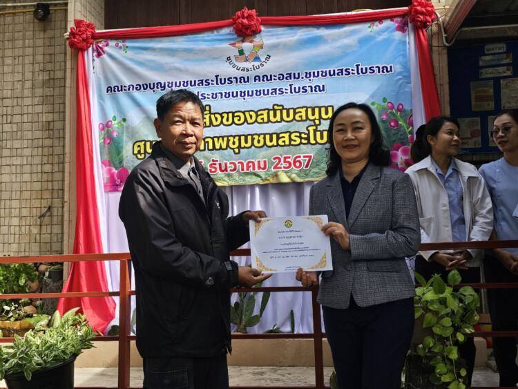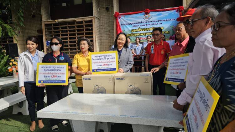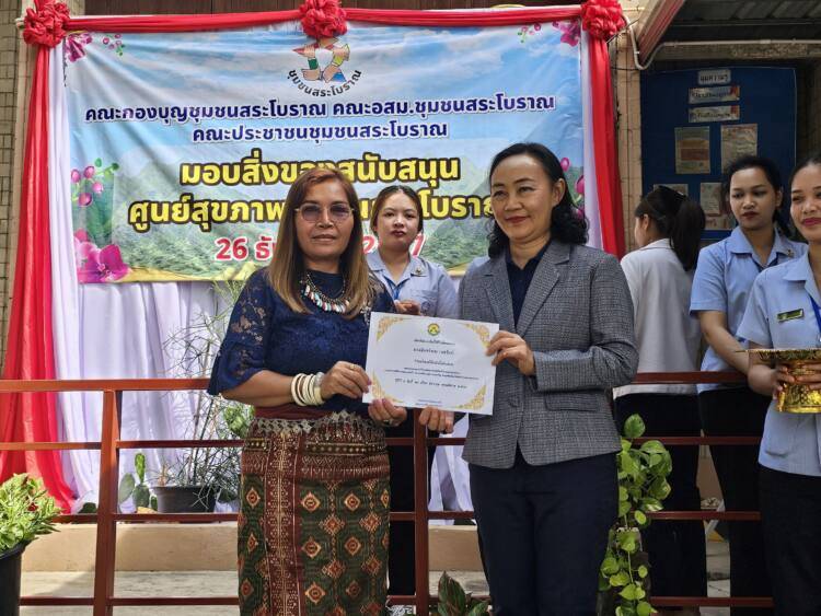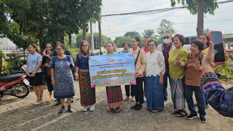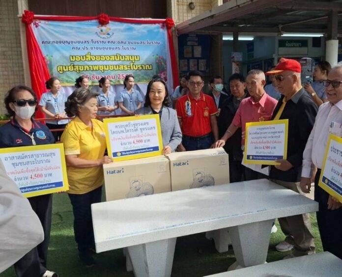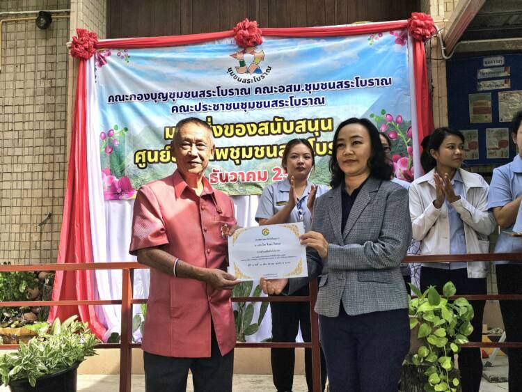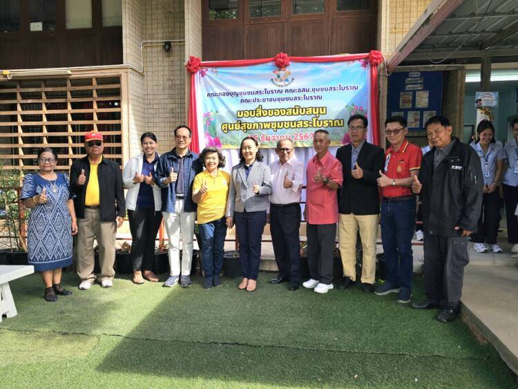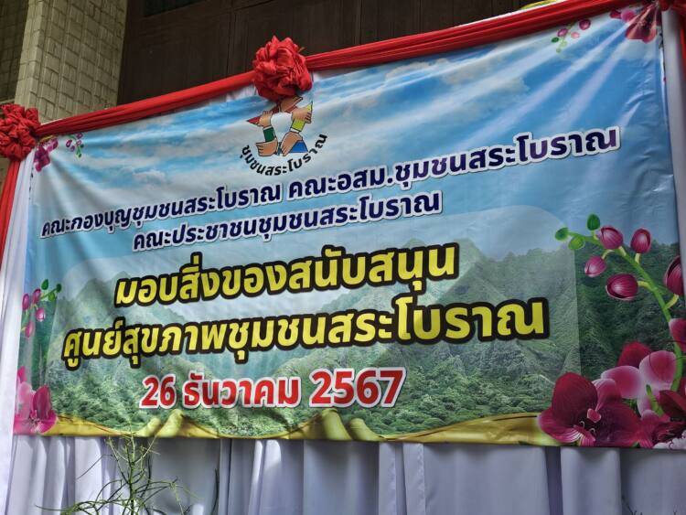 เมื่อเวลา 10.00 น.วันที่ 26 ธันวาคม 2567 ที่ศูนย์สุขภาพชุมชนสระโบราณ อ.เมือง จ.สุรินทร์ คณะกองบุญชุมชนสระโบราณ, คณะ อสม.ชุมชนสระโบราณ, และประชาชนชาวชุมชนสระโบราณ มอบสิ่งของสนับสนุนโต๊ะคอนกรีตหินอ่อน จำนวน 4 ชุด และพัดลมติดเพดาน จำนวน 2 ชุด ให้กับ ทพญ.ศรีกัญยา จำปาเหล็ก กล่าวขอบคุณ และรับมอบที่ชาวชุมชนสนับสนุน ซึ่งศูนย์สุขภาพชุมชนสระโบราณบุคคลลากรคือ พญ.ชญานิศ รัตนกาณจน์ นายแพทย์ชำนาญการ, พญ.ธิดา ริรัตนพงษ์ นายแพทย์ชำนาญการ, และผศ.(พิเศษ)พญ.สิริรัตน์ แสงศิริรักษ์ นายแพทย์เชี่ยวชาญ หัวหน้ากลุ่มงานเวชกรรมสังคม โดยมีนายหิรัณย์ ชูทรงเดช รองประธานสภาวัฒนธรรมจังหวัดสุรินทร์ และประธานกองบุญชุมชนสระโบราณ กล่าวถึงการประชุมร่วมกันระหว่าง อสม., ชุมชนสระโบราณ, และคณะกองบุญสระโบราณ พร้อมด้วยประชาชนในชุมชนสระโบราณ มีมติว่าจะช่วยกันบริจาคเงินได้ ยอดบริจาคทั้งสิ้นจำนวน 15,100 บาท (หนึ่งหมื่นห้าพันหนึ่งร้อยบาทถ้วน) โดยโรงแรมสุรินทร์มาเจสได้เข้ามาช่วยสนับสนุนด้วยซึ่งการมอบสิ่งของโต๊ะหินอ่อนและพัดลมติดเพดานในครั้งนี้ เนื่องจากศูนย์สุขภาพชุมชนสระโบราณเป็นสถานที่ราชการขึ้นตรงต่อโรงพยาบาลสุรินทร์ มีหน้าที่บริการเพื่อแบ่งเบาปัญหาการบริการด้านสุขภาพแก่ผู้เจ็บป่วยจากโรงพยาบาลสุรินทร์ ในกรณีที่ไม่ใช่ผู้ป่วยฉุกเฉิน เช่นการตรวจวัดความดัน เจาะเลือดเพื่อส่งวินิจฉัยโรค จ่ายยา และอื่นๆ