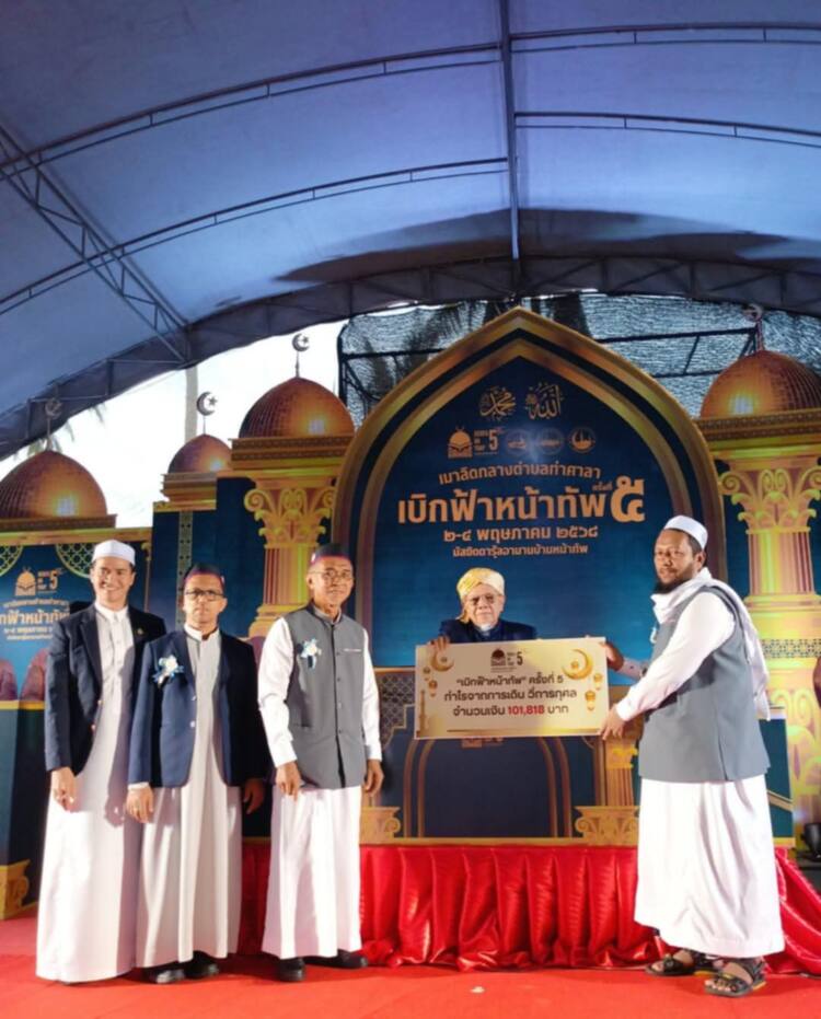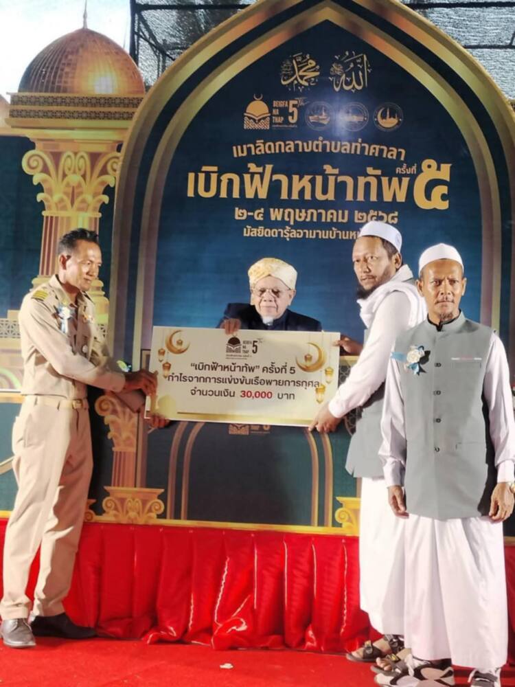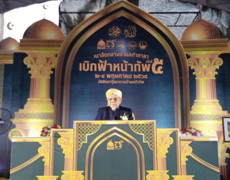 วันที่ 2 พฤษภาคม 2568 ณ มัสยิดบ้านหน้าทัพ ตำบลท่าศลา อำเภอท่าศาลา จังหวัดนครศรีธรรมราช — ท่านอรุณ บุญชม จุฬาราชมนตรี ให้เกียรติเป็นประธานในพิธีเปิดงาน “เมาลิดกลาง ตำบลท่าศลา เบิกฟ้าหน้าทัพ ครั้งที่ 5” ซึ่งจัดขึ้นโดยความร่วมมือของมัสยิดบ้านหน้าทัพ คณะกรรมการชุมชน และภาคีเครือข่าย ทั้งภาครัฐและเอกชน เพื่อระดมทุนพัฒนาและปรับปรุงพื้นที่มัสยิด พร้อมส่งเสริมความรู้ ความศรัทธา และพลังสามัคคีในหมู่พี่น้องมุสลิม