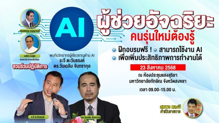 เชิญเข้าร่วมอบรมตามโครงการอบรมเชิงปฏิบัติการ “รู้จักและใช้งานผู้ช่วยอัจฉริยะ AI และ ChatGPT เพื่อเพิ่มประสิทธิภาพการทำงาน” วันเสาร์ที่ 23 สิงหาคม 2568 ณ ห้องประชุมแสงสุริยา มหาวิทยาลัยทักษิณ จังหวัดสงขลา ตั้งแต่เวลา 09.00 น.-15.00 จัดโดยกลุ่มประชาชนไม่เงียบ ร่วมกับ สส.สรรเพชญ บุญญามณี