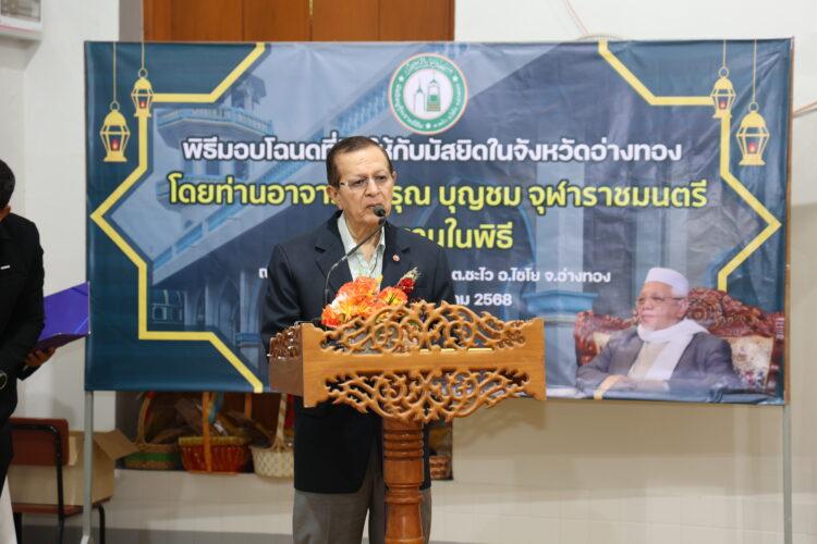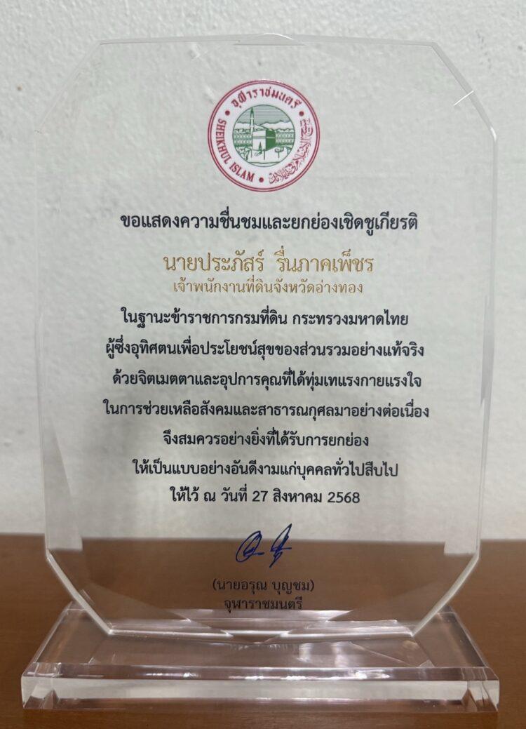 ด้วยความเสียสละและความตั้งใจอันแน่วแน่ในการปฏิบัติหน้าที่ คุณประภัสร์ รื่นภาคเพ็ชร เจ้าพนักงานที่ดินจังหวัดอ่างทอง ได้อุทิศกำลังกาย กำลังใจ และสติปัญญาในการดำเนินการออก โฉนดที่ดินให้แก่มัสยิดและกุโบร์ จนสำเร็จลุลล่วงด้วยความเรียบร้อย เป็นคุณประโยชน์แก่สังคมและ ศาสนาอย่างยิ่ง การกระทำดังกล่าว สะท้อนให้เห็นถึงจิตสำนึกแห่งความรับผิดชอบ ความเสียสละเพื่อ ส่วนรวมและความมุ่งมั่นที่จะอุปถัมภ์กิจการศาสนาอิสลามและสาธารณประโยชน์ สมควรได้รับการยกย่องในฐานะข้าราชการผู้เปี่ยมด้วยคุณธรรม จริยธรรม และเป็นแบบอย่างที่ดีแก่สังคมโดยแท้จริง สำนักจุฬาราชมนตรี โดยท่านจุฬาราชมนตรี (อ.อรุณ บุญชม) จึงได้มอบโล่เกียรติยศเชิด ชูเกียรติแด่ คุณประภัสร์ รื่นภาคเพ็ชร เพื่อประกาศเกียรติคณและสดุดีคุณงามความดี อันควรค่า แก่การสรรเสริญ ยกย่อง และเป็นเกียรติประวัติอันทรงคุณค่าตราบนานเท่านาน