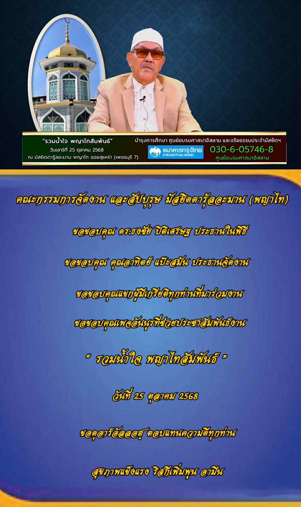 วันที่ 25 ตุลาคม  มัสยิดดารุ้ลอะมาน พญาไท ได้จัดงาน รวมน้ำใจสู่มัสยิดดารุ้ลอะมาน เพื่อหารายได้เพื่อการศึกษาจริยธรรมเยาวชนมุสลิม มีดร.ธงชัย ปิติเศรษฐ  กรรมการกลางอิสลามแห่งประเทศไทย ประธานกรรมการอิสลามประจำจังหวัดสุราษฎร์ธานี เป็นประธานในพิธี ภายในงานมีการออกร้านค้า อาหาร เครื่องดื่ม สิ่งของอุปโภคบริโภค ประมาณ 60 ร้าน โดยทั้งทุนทั้งกำไรมอบให้มัสยิด