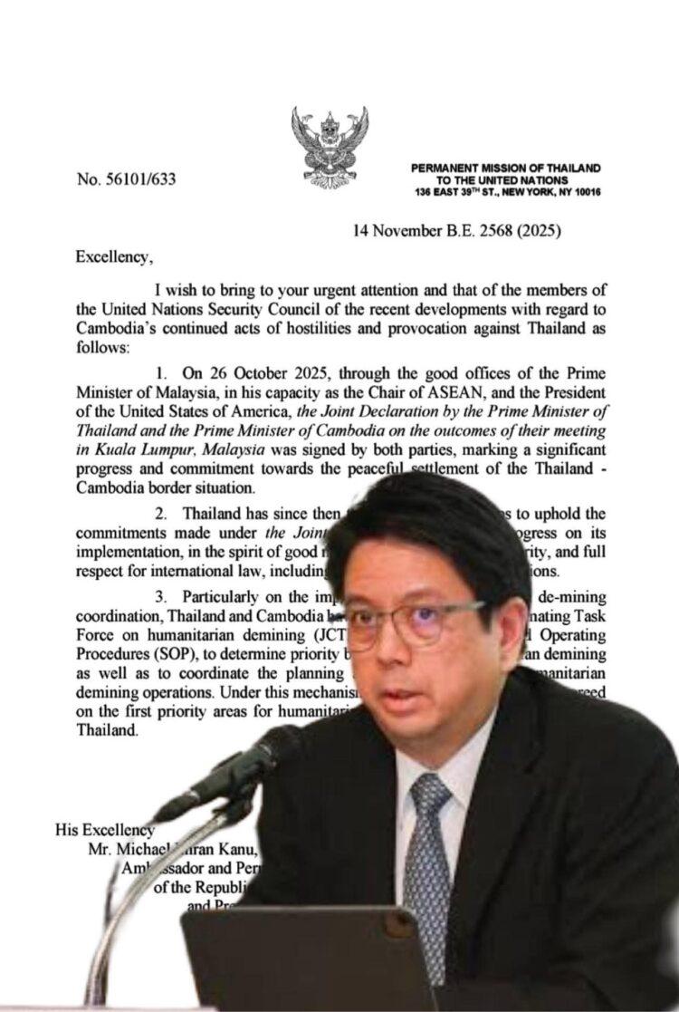 ทูตไทยส่งหนังสือถึง UNSC แจงเหตุ ระงับปฏิบัติตามข้อตกลงสันติภาพ ระบุ กัมพูชายังเป็นปฏิปักษ์และยั่วยุ คุกคามด้วยทุ่นระเบิด วางใหม่ แบบไตร่ตรองไว้ล่วงหน้าและผิดกฎหมายแถมไม่ร่วมมือในการเก็บกู้ทุนระเบิด และยิงใส่ทหารไทยก่อน ที่ สระแก้วไทย จำเป็นต้องตอบโต้ป้องกันตัวแบบได้สัดส่วน