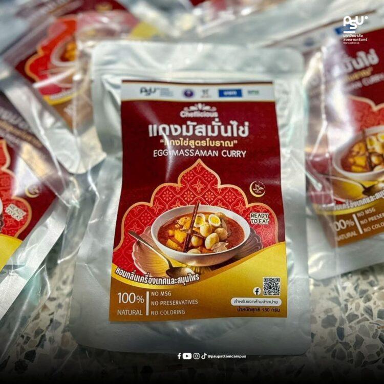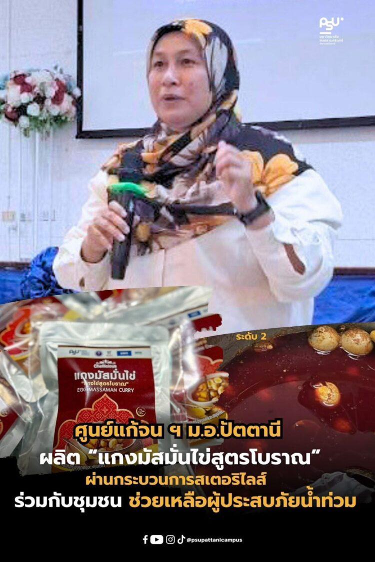 ศูนย์ประสานงานการวิจัยแก้ไขปัญหาความยากจนแบบบูรณาการ จังหวัดปัตตานี ม.อ.ปัตตานี ร่วมกับชุมชน ผลิต “แกงมัสมั่นไข่สูตรโบราณ”นวัตกรรมอาหารพร้อมทาน ที่ผลิตด้วยกระบวนการสเตอริไลส์ หลังชุมชนประสบปัญหาน้ำท่วมหนักช่วงปลายปี 2566 – ต้นปี 2567 จนอาหารเข้าถึงยาก จึงร่วมกันคิดค้นเมนูฉุกเฉินที่กินได้ทันที ไม่เสียง่าย และคุ้นเคยกับพื้นที่ ก่อนพัฒนาเป็นแกงไข่พร้อมทานที่สามารถเก็บรักษาได้นานกว่า 1 ปี