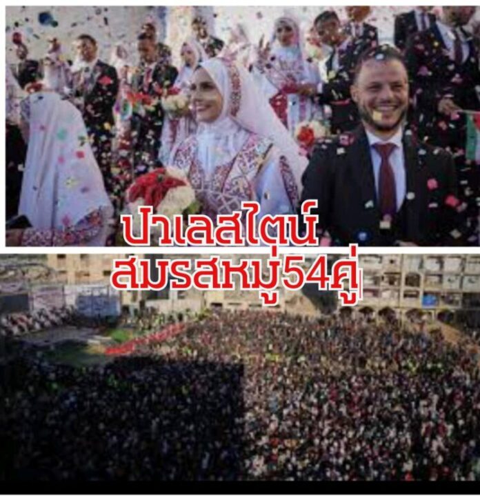 เมื่อวันที่ 2 ธันวาคม 2025 ที่เมือง Khan Younis ทางตอนใต้ของฉนวนกาซา มีพิธี “สมรสหมู่” จัดขึ้น โดยมี คู่รัก 54 คู่ จดทะเบียนสมรสพร้อมกันในงานเดียวกัน