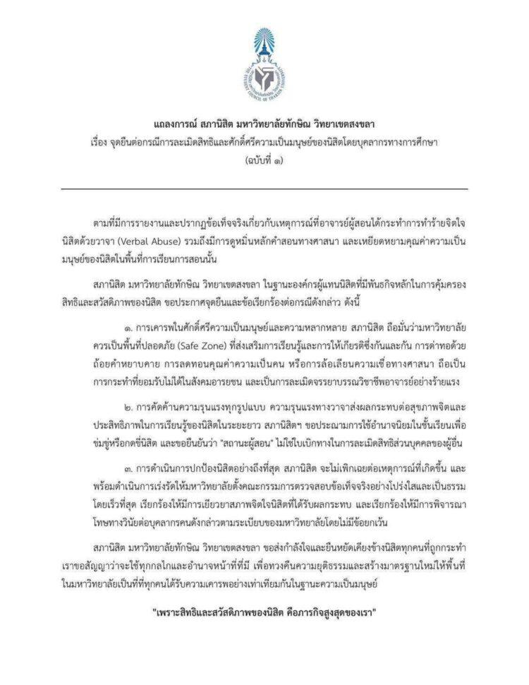 สภานิสิต มหาวิทยาลัยทักษิณ วิทยาเขตสงขลา ในฐานะองค์กรผู้แทนนิสิตที่มีพันธกิจหลักในการคุ้มครองสิทธิและสวัสดิภาพของนิสิต ขอประกาศจุดยืนและข้อเรียกร้องต่อกรณีดังกล่าว ดังนี้
