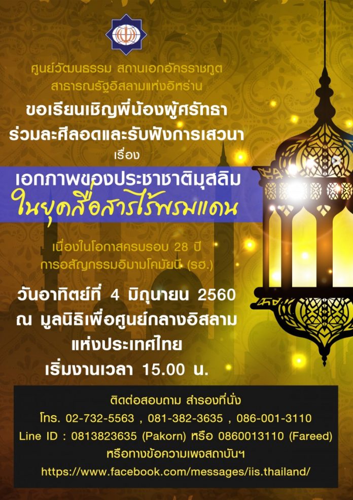 ตามที่สถาบันส่งเสริมการศึกษาและวิจัยเกี่ยวกับอิสลาม ของกลุ่มมุสลิมชีอะห์ในประเทศ กำหนดจัดงานละศีลอดวันอาทิตย์ที่ 4 มิถุนายน และรำลึกถึงการอสัญกรรมอิหม่ามโคมัยนี ผู้นำการปฏิวัติอิหร่าน ณ มูลนิธิเพื่อศูนย์กลางอิสลามในประเทศไทย โดยได้เชิญวิทยากรผู้เสวนาในหัวข้อ เอกภาพมุสลิมในยุคสื่อสารไร้พรมแดน ประกอบด้วย