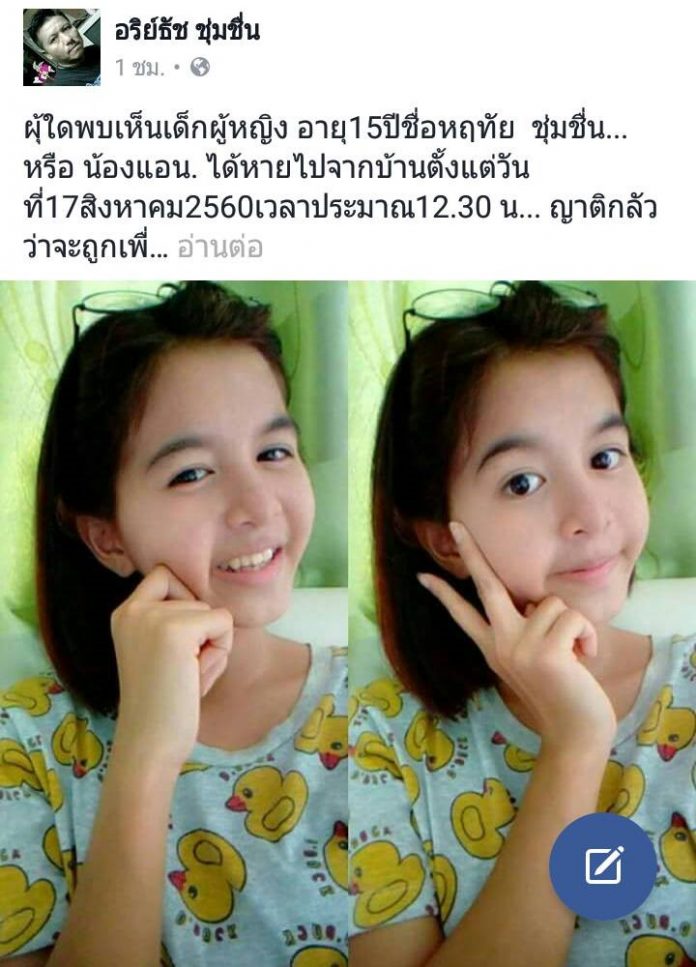 นายอริย์ธัช ชุ่มชื่น ผู้เป็นพ่อแจ้งว่า เด็กหญิงชื่อหฤทัย ชุ่มชื่น หรืน้องแอน อายุ 15 ปี ได้หายไปจากบ้านตั้งแต่วันที่17สิงหาคม2560เวลาประมาณ12.30 น… ญาติกลัวว่าจะถูกเพื่อนที่ติดต่อกันทางเฟสบุ๊คจะล่อลวงไปในทางไม่ดีหรือถ้าหากใครพบเห็นกรุณาติดต่อกลับเบอร์โทร… 0629713132… จักขอบพระคุณเป็นอย่างยิ่งตอนนี้ทางพ่อ และญาติๆ เป็นห่วงน้องมาก… ช่วยแชร์กันเยอะๆน่ะ
