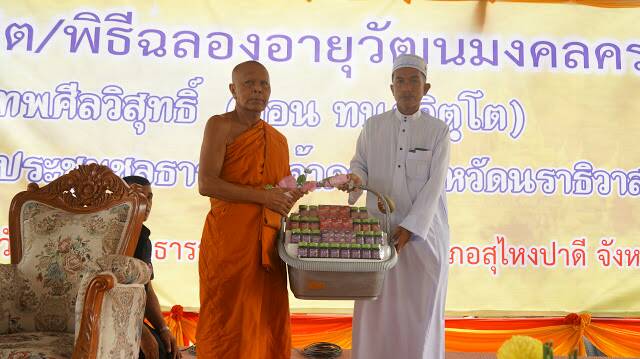 พุทธ-มุสลิมพรึ่บ! ฉลอง 80 ปีเจ้าคณะนราธิวาส 8 มกราคม 2018 FacebookFacebookXTwitterLINELineวันที่ 7 มกราคม มีการจัดงานฉลองอายุวัฒนะมงคลครบ 80 ปีพระเทพศีลวิสุทธิ์ เจ้าอาวาสวัดประชุมชลธารา-เจ้าคณะจังหวัดนราธิวาส มีพี่น้องทั้งพุทธ-มุสลิมร่วมแสดงความยินดีอย่างคับคั่ง สะท้อนภาพความรักความสามัคคีในสังคมพหุภาคีในพื้นที่ 3 จ.ชายแดนใต้ FacebookFacebookXTwitterLINELine