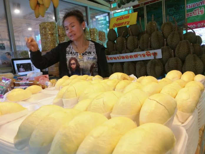ตลาดอตก. ในส่วนของ “ตลาดต้นแบบ” อยู่ระหว่างตลาดอตก. กับตลาดเกษตรอินทรีย์ มีร้านขายทุเรียน “คุณนิด” ขายทุเรียนในราคาที่ฟังแล้ว ต้องตกใจ กิโลกรัมละ 3,000 บาท