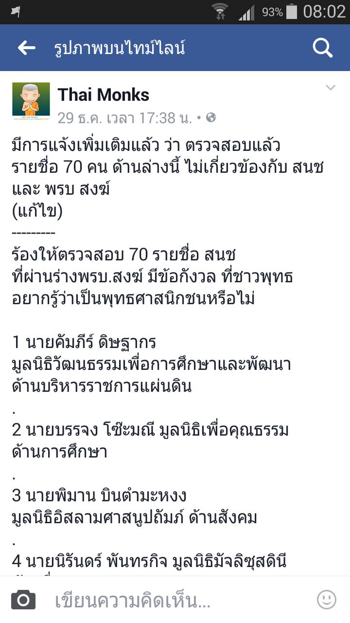 เพจ Thai monk ซึ่งเข้าใจว่า เป็นของกลุ่มธรรมกาย ได้โพสต์ข้อมูลรายชื่อมุสลิม 70 คนอยู่เบื้องกานแก้พรบ.สงฆ์ ที่ได้บัญญัติตัดอำนาจของมหาเถรสมาคมในการทูลเกล้าฯชื่อสมเด็จพระสังฆราช