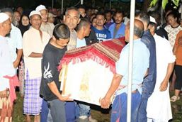 กระทั่งเวลาประมาณ 21.00 น.รถตู้ของหน่วยกู้ภัยร่วมกตัญญูก็นำร่างไร้วิญญาณมาส่งถึงบ้านอย่างเรียบร้อย โดยมีนางสายจิตร อายุ 47 ปี มารดาพร้อมญาติๆ และภรรยาของผู้ตาย เดินทางกลับมาพร้อมกับศพท่ามกลางบรรยากาศเป็นไปด้วยความโศกเศร้า จากนั้นก็ได้นำร่างทำความสะอาด โดยให้ครอบครัว พี่น้อง เพื่อนๆ และให้ญาติร่วม จากนั้นก็สวมเครื่องแต่งกาย และนำร่างลงในหีบศพที่เตรียมไว้และนำไปกุโบร์ (สุสาน) สาธารณประโยชน์บ้านนาป้อ ม.8 ต.ควนปริง ซึ่งอยู่ห่างจากบ้านประมาณ 2 กม.เพื่อประกอบพิธีฝังตามศาสนาอิสลาม
