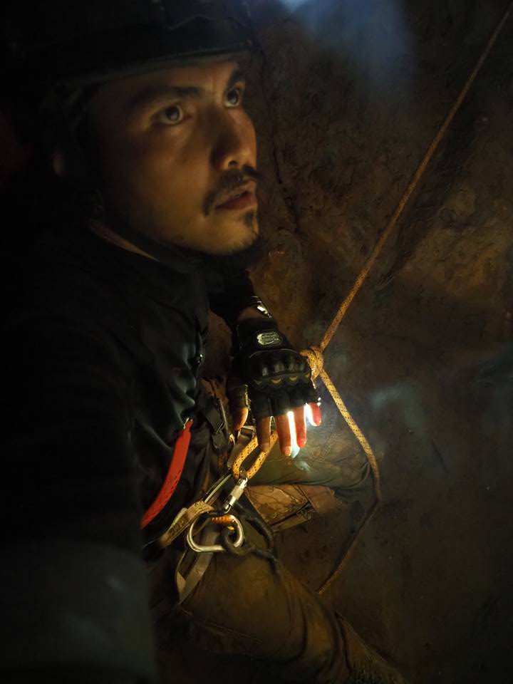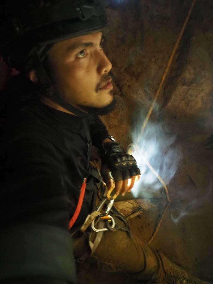 ตรวจสอบระบบเชือกเซฟตี้ว่าปกติ และตะโกนบอกพี่ชัยว่าจะลงไปในปล่องแคบลึกด้านล่าง พบว่าช่องทางนั้นแคบมากต้องงัดหินหลายก้อนที่กลิ้งขวางอยู่บางก้อนนั้นหลุดลงไปในความลึก มันลึกมากซึ่งกว่าจะชนกระทบพื้นข้างล่างก็กินเวลาหลายวินาที