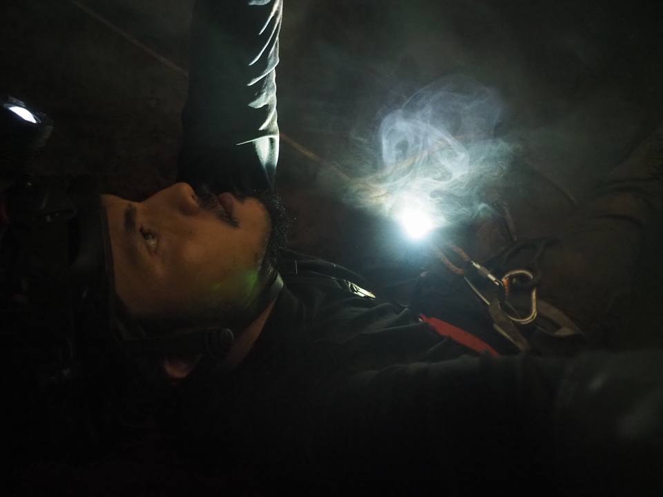 และแล้ว ระหว่างกำลังแทรกตัวผ่านช่องหินพร้อมไฟที่หมวกสาดส่องไปข้างหน้านั้น ก็สังเกตุเห็นบางอย่างคล้ายๆกลุ่มควันหรือหมอก