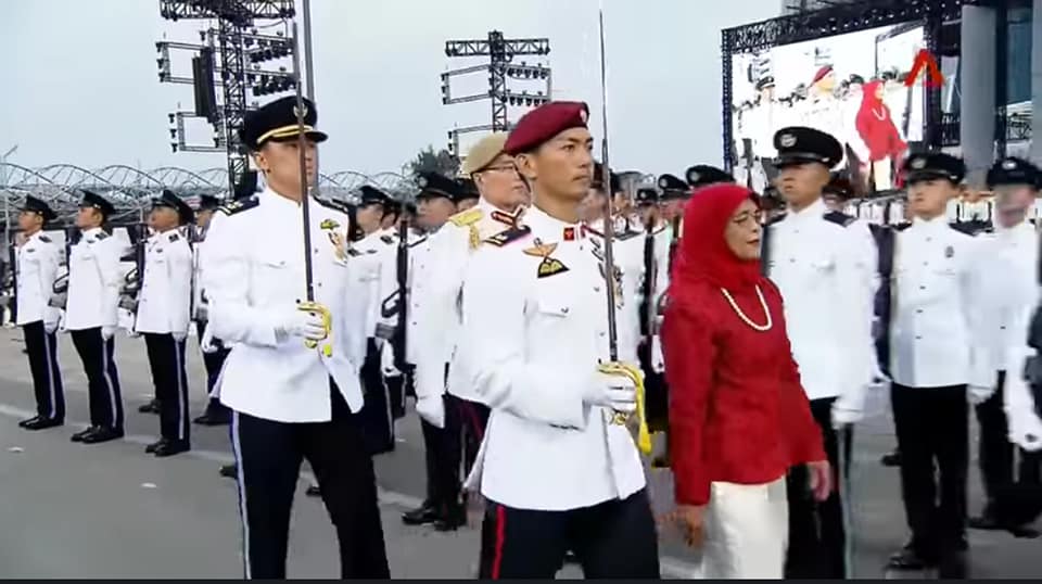ฮาลิหม๊ะ ยะโก๊ป ประธานาธิบดีหญิง(มุสลิม) คนแรกของประเทศสิงคโปร์ เดินตรวจทหารกองเกียรติิยศเนื่องในวันชาติ เธอเป็นมุสิลมหญิงคนแรกที่ได้เป็นประธานาธิบดีสิงคโปร์