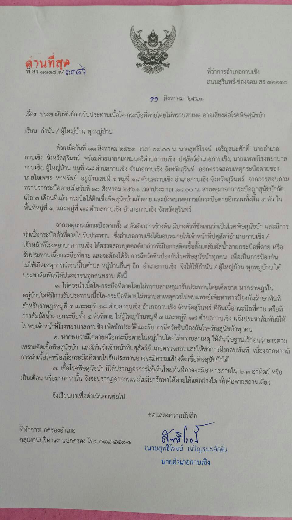 เมื่อเวลา 10.30 น. วันที่ 15 สิงหาคม 2561  นายประเสริฐ  สรรเพชุดาญาณ  ปศุสัตว์จังหวัดสุรินทร์   เผยถึงมาตรการในการควบคุมดูโรคพิษสุนัขบ้า ซึ่งทางปศุสัตว์จังหวัดได้ปฏิบัติการควบคุมดูแลมาโดยตลอด  และโดยเฉพราะ กระบือตายจำนวน 4 ตัว โดยกระบือตัว ซึ่งเจ้าของได้ชำแหละเนื้อแบ่งขายให้คนในหมู่บ้าน หมู่ที่  3 และหมู่ที่ 18  ตำบลกาบเชิง, อำเภอกาบเชิง จังหวัดสุรินทร์  กระบือตัวที่  2  เป็นของนายประสิทธิ์ สายรัด หมู่ที่ 18  ตำบลกาบเชิง ตายเมื่อ 1 อาทิตย์ที่ผ่านมา  สาเหตุถูกสุนัขบ้ากัดเมื่อ 3 เดือนก่อน  อาการเพิ่งมาปรากฏ เมื่อตายเจ้าของนำกระบือไปฝังทันที,  ส่วนกระบือตัวที่ 3 ของนายใจเพชร หาทรัพย์ หมู่ที่ 18  ตำบลกาบเชิง ตายเมื่อวันที่ 10  ส.ค.25 61  เวลา 08.00 น. ซึ่งเจ้าหน้าที่ปศุสัตว์ ได้ทำการตัดหัวไปตรวจที่ศูนย์วิจั ยและพัฒนาการสัตว์แพทย์ภาคตะวันออกเฉียงเหนือตอนล่าง   ผลการตรวจเป็นโรคพิษสุนัขบ้า   ซึ่งช่วงนำหัวไปตรวจ เจ้าหน้าที่ได้แจ้งกำชับให้เจ้าของ นำเอากระบือไปฝัง ห้ามนำไปชำแหละ โดยเด็ดขาด  แต่เจ้าของเสียดาย จึงได้ชำแหละเนื้อแบ่งกันกินทั้งหมู่บ้านหมู่ที่ 18 รวมทั้งหมู่บ้านข้างเคียง