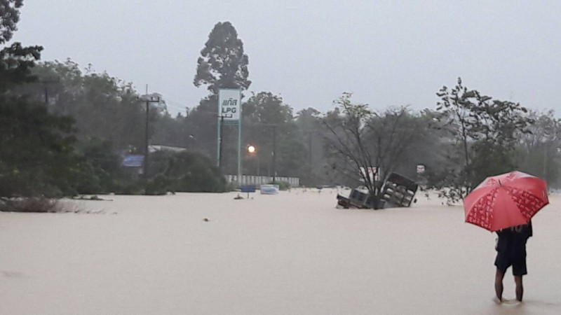 กลางดึกคืนวันที่ 5 ม.ค. ที่ จ.นครศรีธรรมราช หลังจากฝนตกหนักติดต่อกันตลอดทั้งคืนทำให้เกิดน้ำป่าไหลหลากเข้าตัวอำเภอทุกตำบล ท่วมถนนหลายสาย และไหลบ่าเข้าท่วมย่านการค้าตลาดอำเภอทุ่งสงอย่างรวดเร็ว ระดับความสูงไม่ต่ำกว่า 1 เมตร ทำให้ตัวตลาดอำเภอทุ่งสงจมอยู่ใต้บาดาลภายในพริบตา ขณะเดียวกันที่ถนนสายเอเชีย 41 ช่วง อ.ทุ่งสง-สุราษฎร์ธานี หลายจุดไม่ว่าจะเป็นบ้านช่องเขา หน้าถ้ำผาทอง และอีกหลายจุดถูกน้ำท่วมจนทำให้การสัญจรไปมาบนถนนสายเอเชีย 41 ที่ผ่าน อ.ทุ่งสง ถูกตัดขาดโดยสิ้นเชิง ไม่สามารถสัญจรไปมาได้เช่นกัน