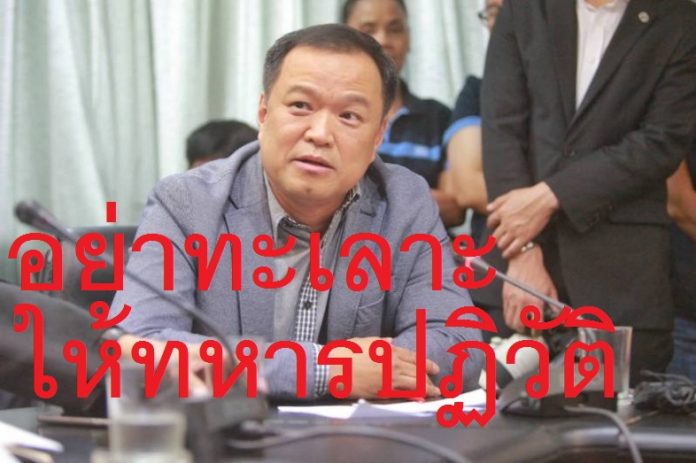 “มีผู้สมัครท่านหนึ่ง เคยสาบานว่าจะไม่เล่น ไม่ยุ่งเกี่ยว กับการเมือง แล้วก็ถอนคำสาบาน แล้วมายุ่งเกี่ยวอะไรกับพรรคภูมิใจไทย แล้วเราก็เห็นว่า สิ่งที่ชาวบ้านเบื่อที่สุดคือ การทะเลาะกันเองของพวกเรา แล้วการทะเลาะกันของนักการเมืองในอดีตเป็นการเปิดให้อำนาจนอกระบบเข้ามา ผมคิดแค่นี้ แล้วรู้สึกว่าอีกไม่กี่เดือน ไม่เกิน 1 ปี ต้องเกิดการเลือกตั้งในเมืองไทย แต่โอ้โห หายไป 5 ปี แทนที่จะดีกัน นึกถึงทำยังไงให้ระบอบประชาธิปไตย มีความศักดิ์สิทธิ์ แต่ดันกลับมาในบริบทเลย สาดเสียเทเสียให้กัน โป้ปดมดเท็จ เด็กเลี้ยงแกะ โยนของเสียให้คนอื่น แล้วมันต่างกันอย่างไร แบบนี้เมืองไทยก็จะต้องมีปฏิวัติอีกหรือเปล่า แล้วเมื่อไหร่จะจบสิ้น” นายอนุทิน กล่าว