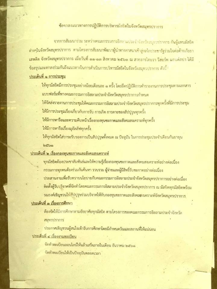 สัตยาบันคณะกรรมการอิสลามประจำจังหวัดสมุทรปราการ ออกมาเมื่อวันที่ 13 สิงหาคม 2561 ลงนามโดยอิหม่าม 12 มัสยิด จาก 13 มัสยิด โดยนายไพศาล พรหมยงค์ ประธานกอ.สมุทรประการเป็นผู้รับสัตยาบัน โดยสัตยาบันฉบับดังกล่าวมาจากการประชุมอิหม่ามและคณะกรรมการมัยิดในจังหวัดสมุทรปราการ ระหว่างวันที่ 11-13 สิงหาคม ที่สายธารไอยรารีสอร์ท แอนด์สปา ระบุ เป็นขอตกลงแนวทางการปฏิบัติบริหารมัสยิดในจังหวัดสมุทรปราการ กำหนดไว้ 7 ข้อ ประกอบด้วย 1. การประชุม กำหนดให้ทุกมัสยิดประชุมทุกเดือน และทำรายงานส่งกอ.สมุทรปราการ 2. เรื่องกองทุนซะกาตและสังคมสงเคราะห์ให้ทุกมัสยิดประชาสัมพันํ์เรื่องซะกาตและการสังคมสงเคราะห์ และจัดทำบัญชีผู้จ่ายผู้รับให้ชัดเจน 3.จัดให้มีการศึกษาอิสลามทุกมัสยิด 4.ให้มีการจัดทำทะเบียนออนไลน์ให้เสร็จในเดือนธันวาคม 2561 5.ให้กรรมการอิสลามประจำจังหวัดสมุทปราการจัดบุคคลไปคุตบะห์อย่างน้อยเดือนละครั้ง 6. เรื่องยาเสพติดมีการวางระเบียบเพื่อลงโทษสปบุรุษ และ7. การนิกะห์ ให้ทุกมัสยิดใช้แบบฟอร์มการนิกะห์ของกอ.สมุปทรการ ในกรณีมุอัลลัฟจะต้องผ่านการศึกษาศาสนาอิสลาม มีหนังสือการรับรองการเข้ารับอิสลาม และมีการเปลี่ยนศาสนาในบัตรประชาชน