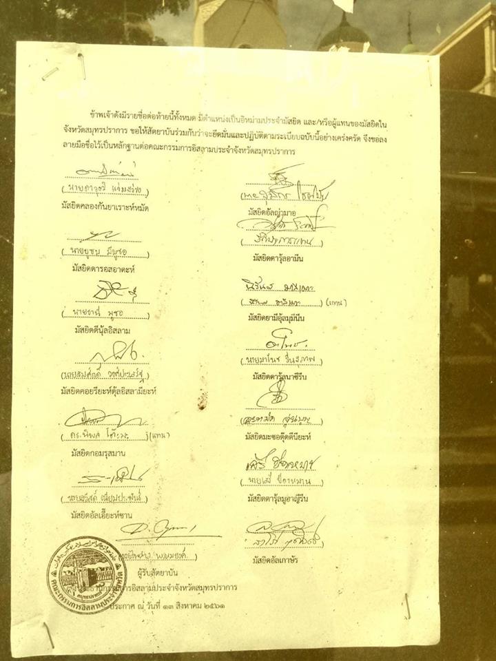 มัสยิดแห่งนี้ ได้ปิดประกาศสัตยาบันของ กอ.สมุทรปราการไว้ที่บอร์ดของมัสยิด แต่เมื่อมีกระแสต่อต้านจากชาวบ้าน จึงได้นำสัตยาบันดังกล่าวไปเก็บไว้