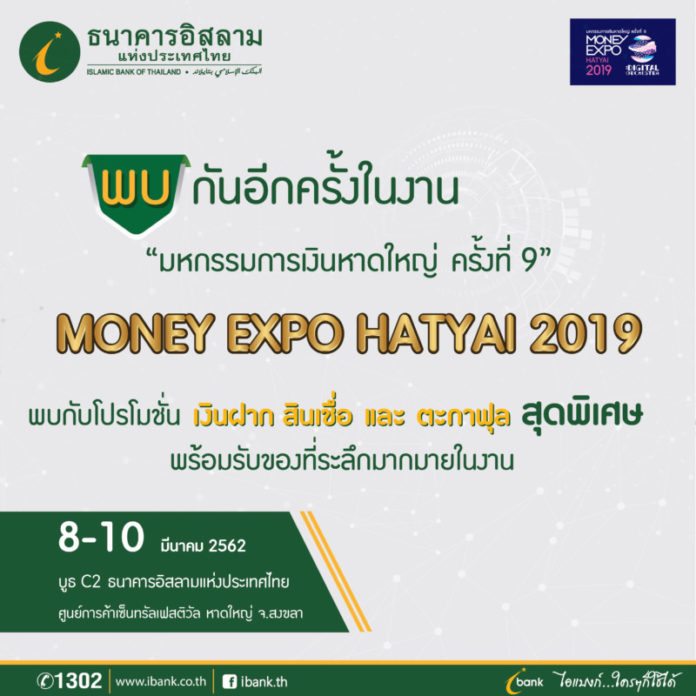ธนาคารอิสลามแห่งประเทศไทย (ไอแบงก์) ร่วมงานมหกรรมการเงินหาดใหญ่ ครั้งที่9 Money Expo Hatyai 2019 ที่จะมีขึ้นระหว่างวันที่ 8-10 มีนาคม 2562 ณ หาดใหญ่ฮอลล์ ศูนย์การค้าเซ็นทรัลเฟสติวัล หาดใหญ่ อ.หาดใหญ่ จ.สงขลา โดยภายในงานไอแบงก์ได้เตรียมโปรโมชั่นเด็ดเอาใจลูกค้าชาวใต้ล่างทั้งสินเชื่อที่อยู่อาศัย สินเชื่อธุรกิจ เงินฝาก และตะกาฟุลมากมาย