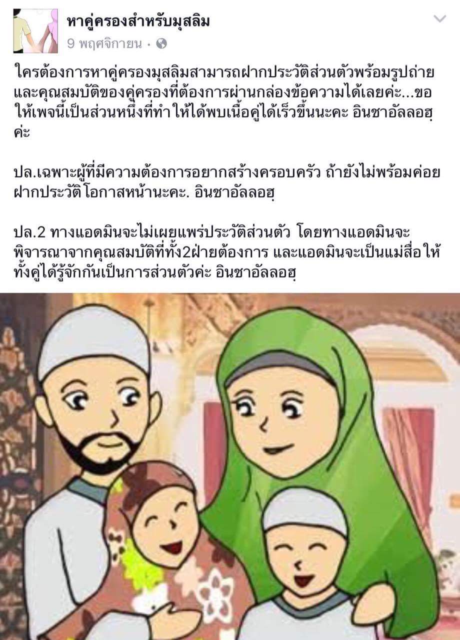 กำลังเป็นที่พูดถึงกันอย่างกว้างขวางกรณีมีบุคคล เปิดเพจ หาคู่ครองสำหรับมุสลิม โดยเพจนี้เปิดเมื่อวันที่ 9 พ.ย. ระบุ จุดประสงค์ให้มุสลิมชายและหญิงส่งข้อมูลส่วนตัวและคุณสมบัติของคู่ที่อยากได้ส่งเข้า อินบ็อก ทางเพจจะดำเนินการจัดคู่ให้