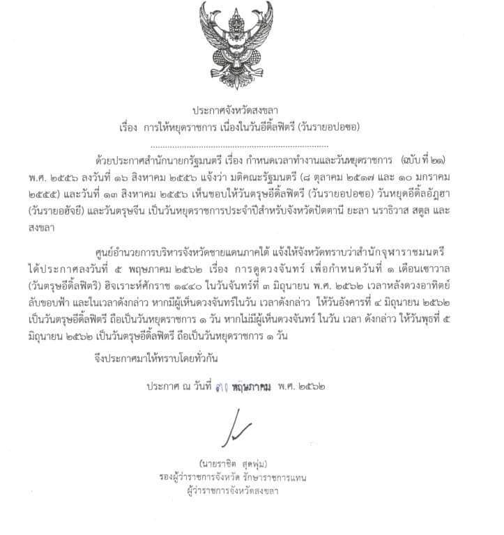 วันที 30 พฤษภาคม 2562 นายราชิต สุขพุ่ม ผู้ว่าราชการจังหวัดสงขลา ได้ประกาศวันหยุดราชการ เนื่องในเทศกาลอีดิลฟิตรีของพี่น้องมุสลิม