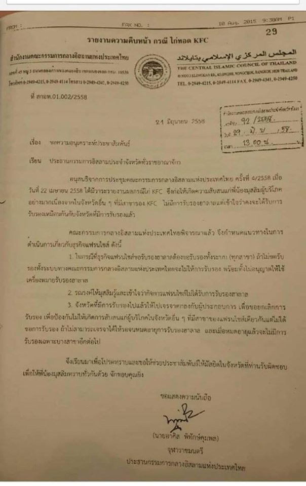 ขณะเดียว ตามหนังสือของสำนักงานคณะกรรมการกลางอิสลามแห่งประเทศไทย ลงนามโดยนายอาศิส พิทักษ์คุมพล จุฬาราชมนตรี ที่ออกเมื่อเดือนมิถุนายน 2558 ถึงประธานคณะกรรมการอิสลามประจำจังหวัดทั่วประเทศ กรณีไก่ KFC ว่าก่อให้เกิดความสับสน ที่ประชุมคณะกรรมการกลางอิสลามฯจึงเห็นชอบให้การระบรองฮาลาลปฟรนไชส์ จะต้องขอการรับรองทั้งระบบ ไม่ใช่ส่วนใดส่วนหนึ่งหรือจังหวัดหนึ่ง