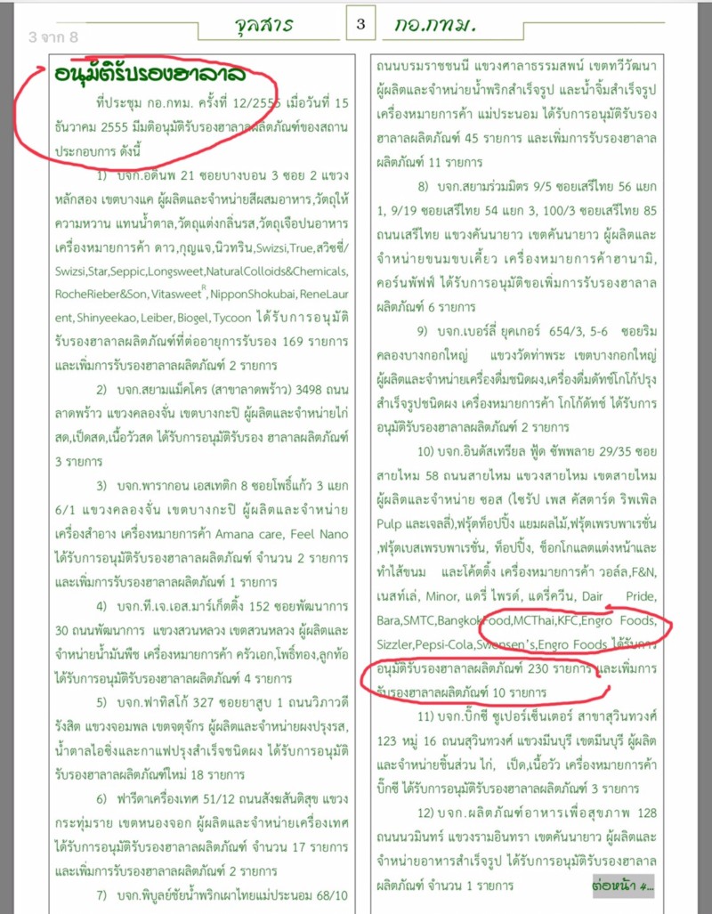 จุลสารกอ.กทม. ปี 2556 ของคณะกรรมการอิสลามประจำกรุงเทพมหานคร หน้า 3 ได้เผยแพร่ข้อมูลระบุว่า ที่ประชุมกอ.กทม.ครั้งที่ 12/2555 เมื่อวันที่ 15 ธันวาคม 2555 มีมติอนุมัติรับรองฮาลาลผลิตภัณฑ์ของสถานประกอบการดังนี้