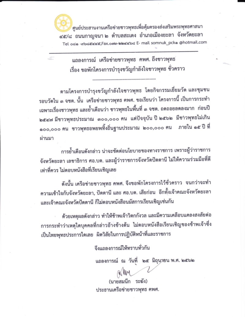 คือ 1 ผู้ว่าราชการจังหวัดปัตตานีและ 2 เจ้าคณะจังหวัดปัตตานี ไม่ตอบหนังสือรับของศูนย์ประสานงาน เครือข่ายชาวพุทธ (คพศ) ทั้งที่เป็นโครงการที่ดีทำให้เกิดความ รักสามัคคีเกื้อกูลกัน